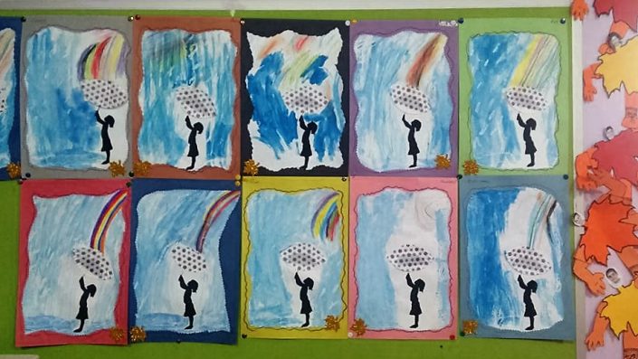 mum ile yağmur damlaları çizilen kağıda çocuklar gökkuşağı çizip sonrasında sayfayı suluboya ile boyadılar