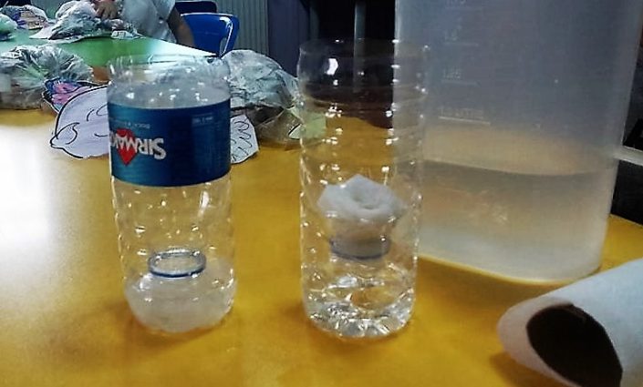son olarak tuvalet eğitiminde kullanılacak tuvalet kağıdı miktarının neden çok olmaması gerektiğini anlamak için iki pet şişe ortadan kesildi. şişişenin alt tarafı kanalizasyonu üst tarafı da klozeti temsil etti .ilk tuvalete(şişenin üst kısmına) az miktarda tuvalet kağıdı atıldı ve üstüne su dökünce kağıdın hemen gittiği gözlemlendi. ikinci tuvalete ise daha fazla kağıt atıldı ve su döküldüğünde kağıdın gitmediği ve giderde biriktiği gözlemlendi.