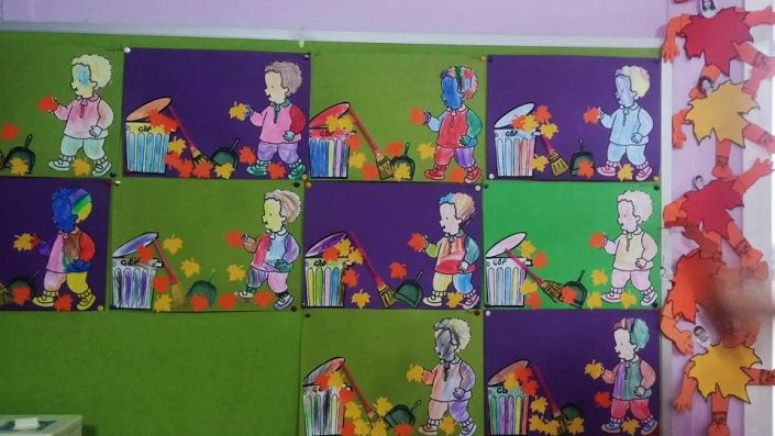 sonbahar mevsimi ve çevre temizliğini pekiştirmek için boyanan ve kesilen görseller fon kağıdında biraraya getirildi