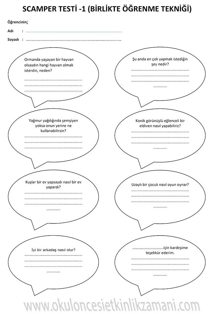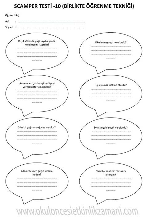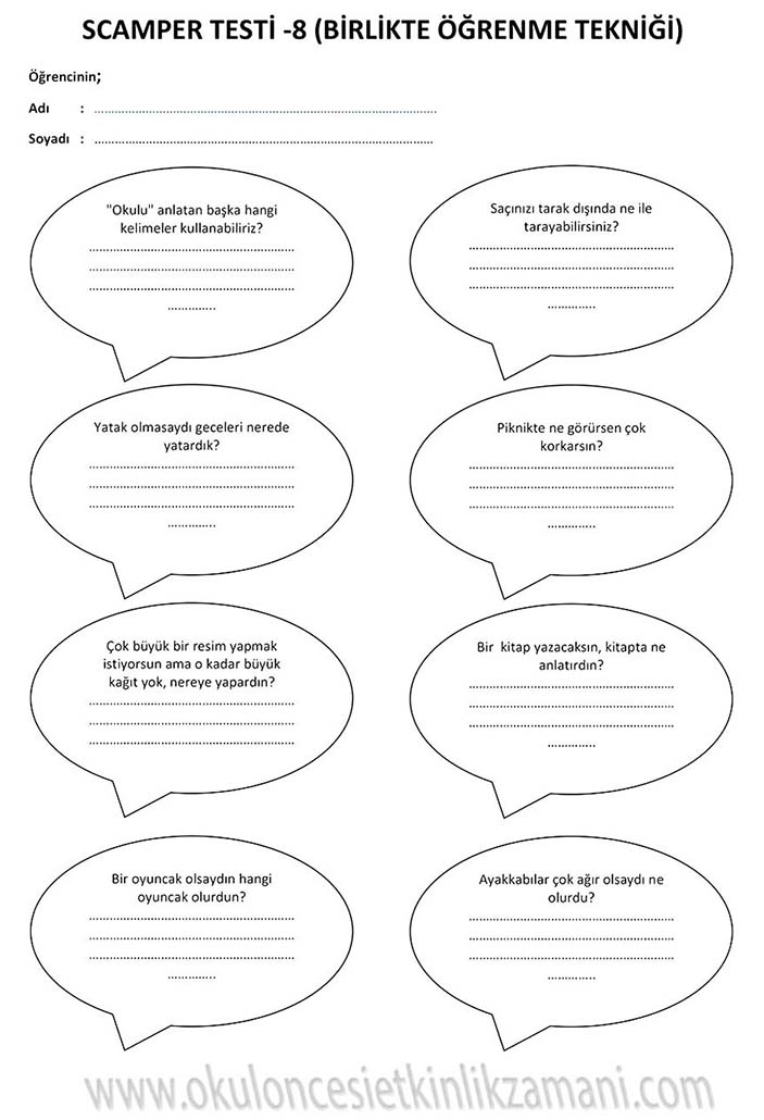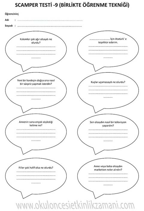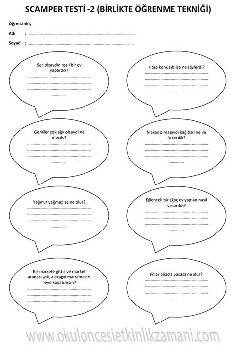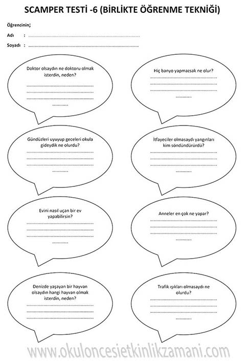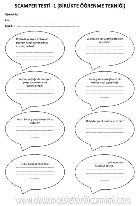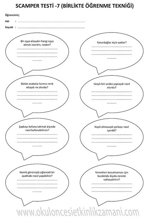SCAMPER Çocuklarımızın yaratıcılığını geliştirmede ve hayal gücü, sezgi, düşünme, orjinallik hazinelerini korumada scamper yöntemini kullanıyoruz. Bu yöntem, çocuklara düşüncelerini değiştirmeleri ya da birleştirmeleri konusunda adım attırarak yaratıcı düşünmelerini sağlar. Scamper yöntemi okul öncesinden başlayarak her düzeyde eğlenceli bir şekilde uygulanabilir. Bu yöntem tek bir nesneye yöneltilen düşünme yöntemi serisidir. Bunun için tek bir nesne seçilir ve beyin fırtınası yoluyla bu nesne değiştirilip geliştirilebilir. Bunu yapmak için çocuğa sorular sorulur. Bu sorular çocuğun daha önce alışık olmadığı şekilde düşünmesini sağlar. Bu sorular bir anlamda farklı düşünme becerilerini kazandırmaya yönelik itici bir güçtür. Çocukların düşüncelerini geliştirip onların keşif yapmasını cesaretlendirir. Yaratıcılıklarını ve kendi görüşlerini geliştirmeleri için gereksinimlerine uygun pratik yapma olanağı yaratır. Ayrıca esnek düşünmeyi ve kalıpları yıkmayı öğretir. Çocuğa yaratıcılıkla ilgili ne kadar çok çalışma yaptırılırsa farklı düşünme becerisi de o oranda gelişir.