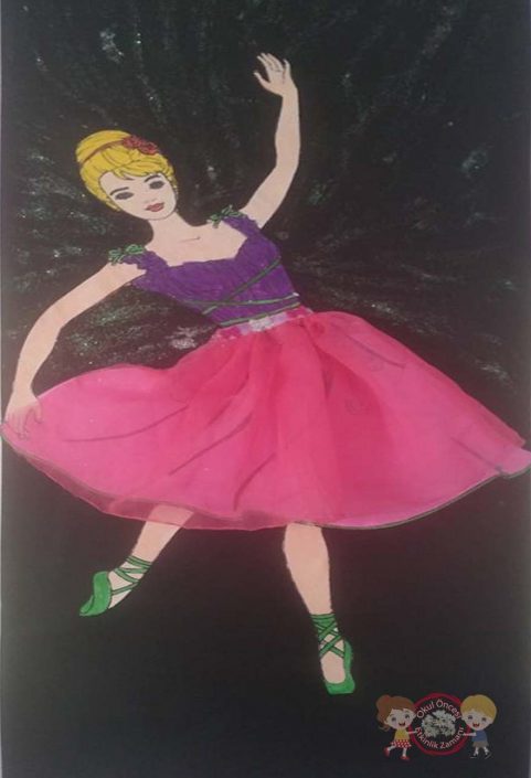 balerin kızı çocuklar boyadıktan sonra şifon kumaş kurdela ve sim kullanarak çalışmamızı tamamladık