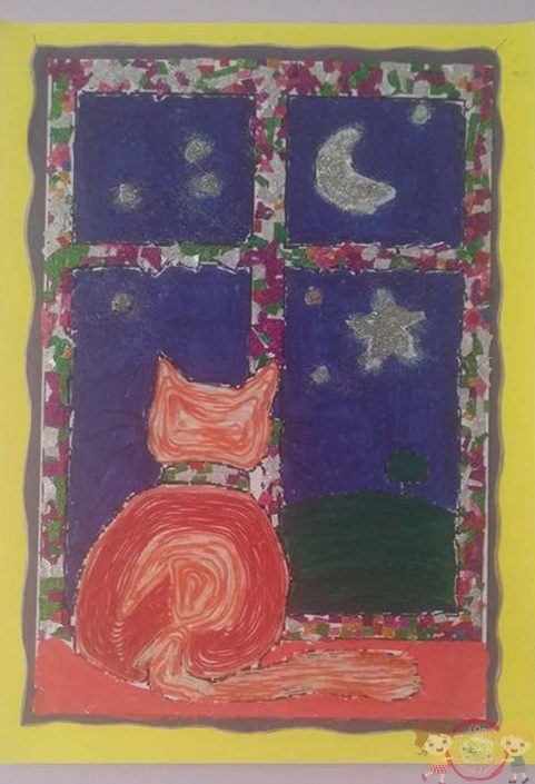 artık yün ipten kedimizi, daha önce ki etkinliklerimizden artan simli evalardan çerçevemizi yaptıktan sonra biraz boya birazda sim kullanarak çalışmamızı tamamladık