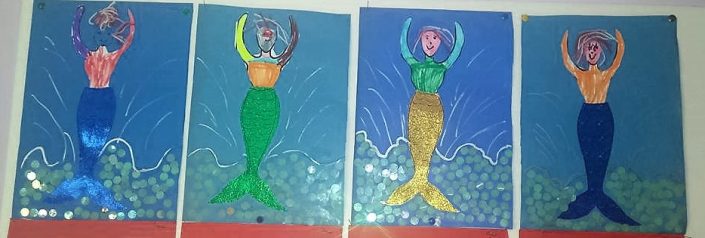 deniz kızı görseli boyanıp kesildi parlak elişi kağıdından kuyruğu, yün iplikten saçları ve pullardan da denizi yaparak çalışma tamamlandı